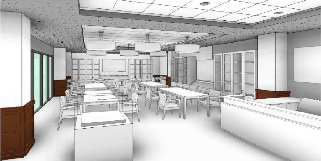 One of the greatest areas of improvement between the existing library and newly renovated library will be the spaces for Special Collections and Archives. These unique and valuable collections will be brought from disparate locations with an inconsistent environment to an intentionally designed space that will have appropriate preservation conditions (controlled for light, temperature, and humidity), adequate space for processing collections, and built-in exhibition cases to display select materials to the public.